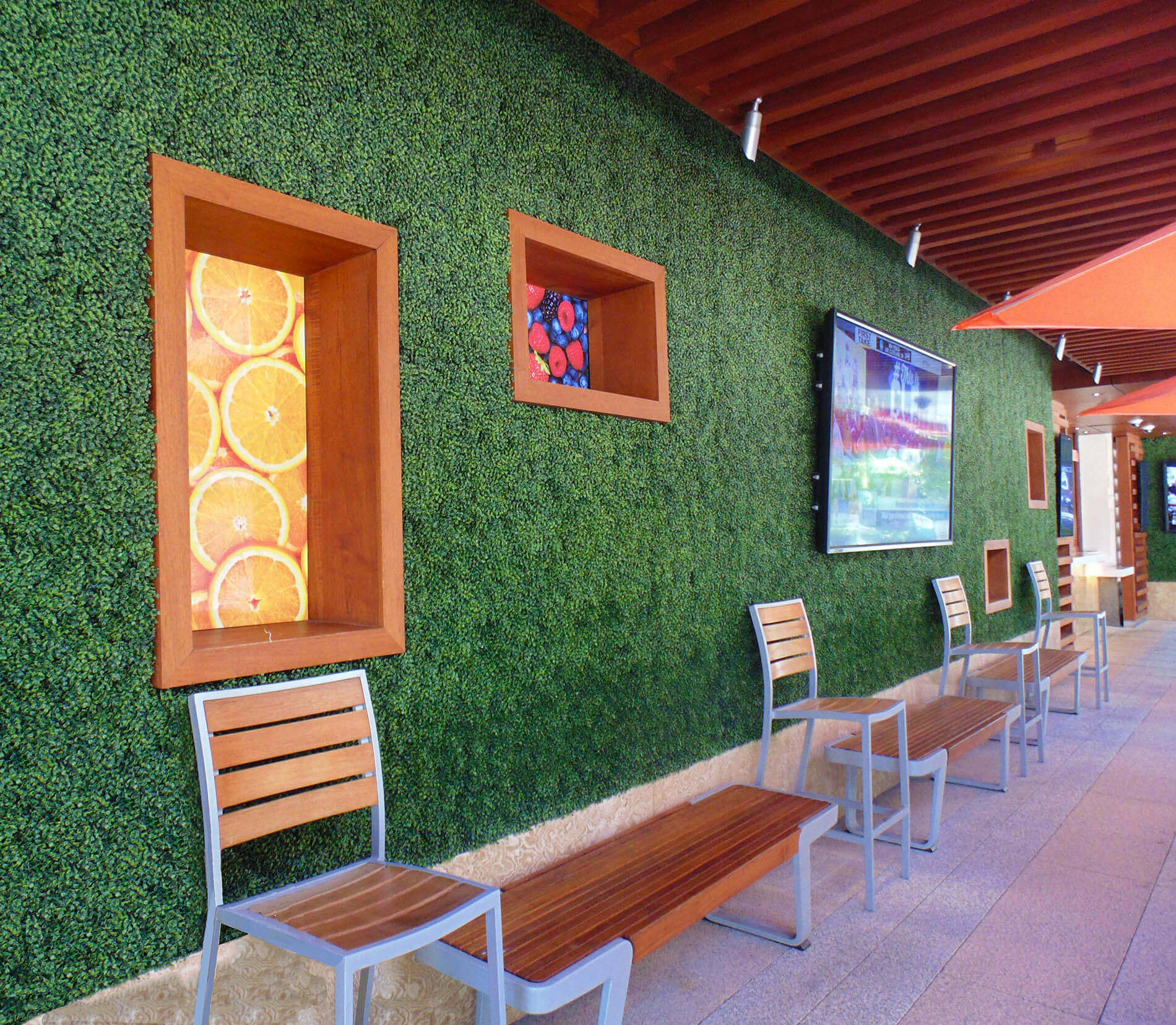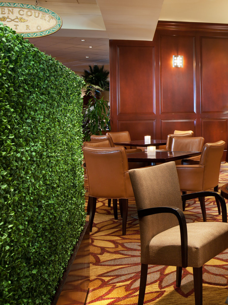 This hotel features a beautiful outdoor garden dining area. They used our Artificial Boxwoods to bring outside greenery into the lobby. These low Green Walls divide the seating areas and entry space for the Garden Court Bistro.