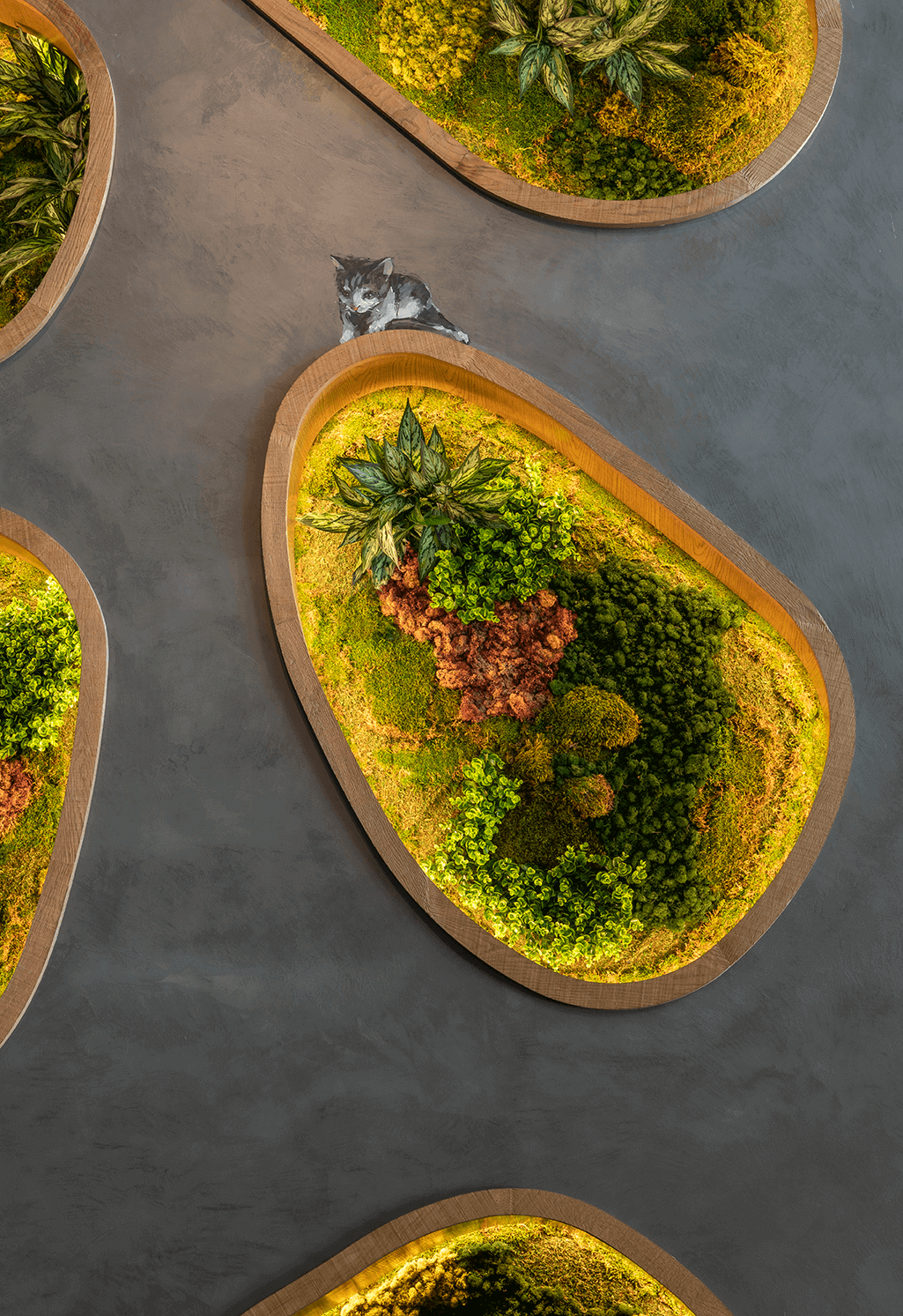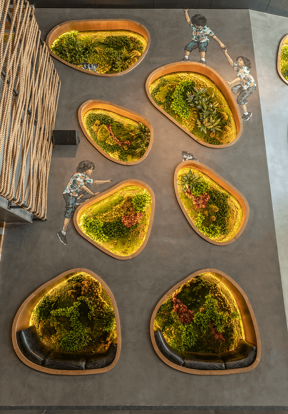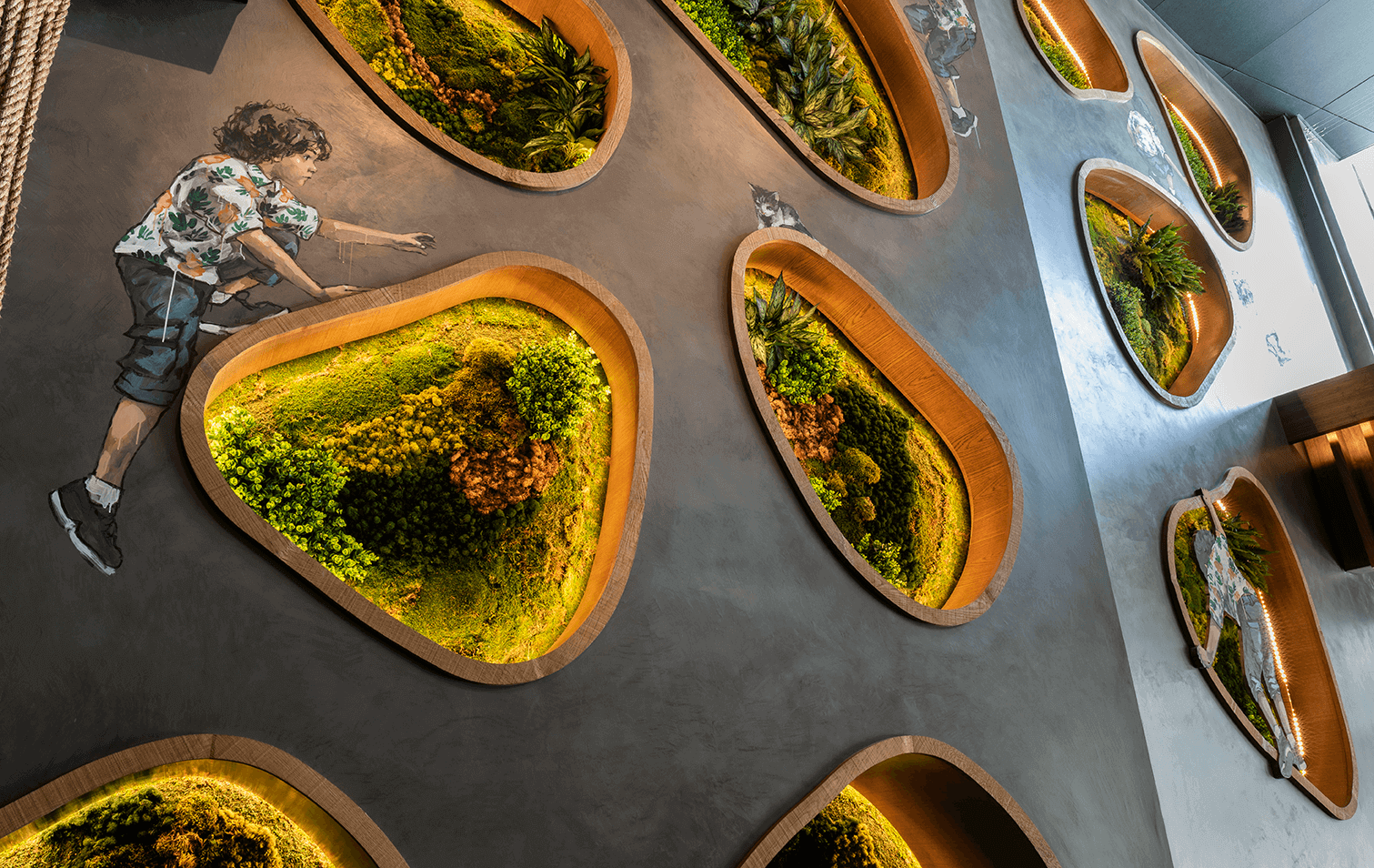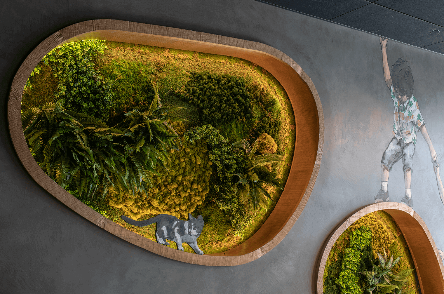 The wall features cozy cushioned nooks that are designed for seating, climbing, or lounging. Each nook has a background of preserved moss, along with replica ferns, Hosta plants, and tropical foliage. Zacharevic’s paintings add life and whimsy to this unique piece of mixed-media art.