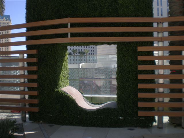 Artificial Phoenix dactylifera Palm Trees were installed around the pool area, providing much-needed shade from the Vegas sun. Some have Leafy Column Wraps around their trunks, while others are left “natural.” The exterior pool and lounge area also feature our Artificial Green Walls and Artificial Boxwood Hedges.