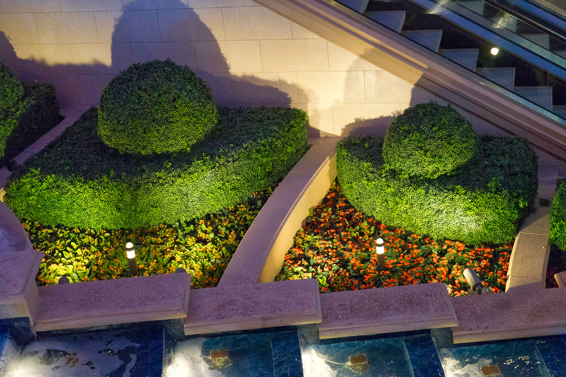Guests who ride the escalator alongside the fountain are treated to a stunning view of the multi-tiered waterway, which is adorned by beautifully manicured artificial hedges and topiaries that have been designed, constructed, and installed by the team.