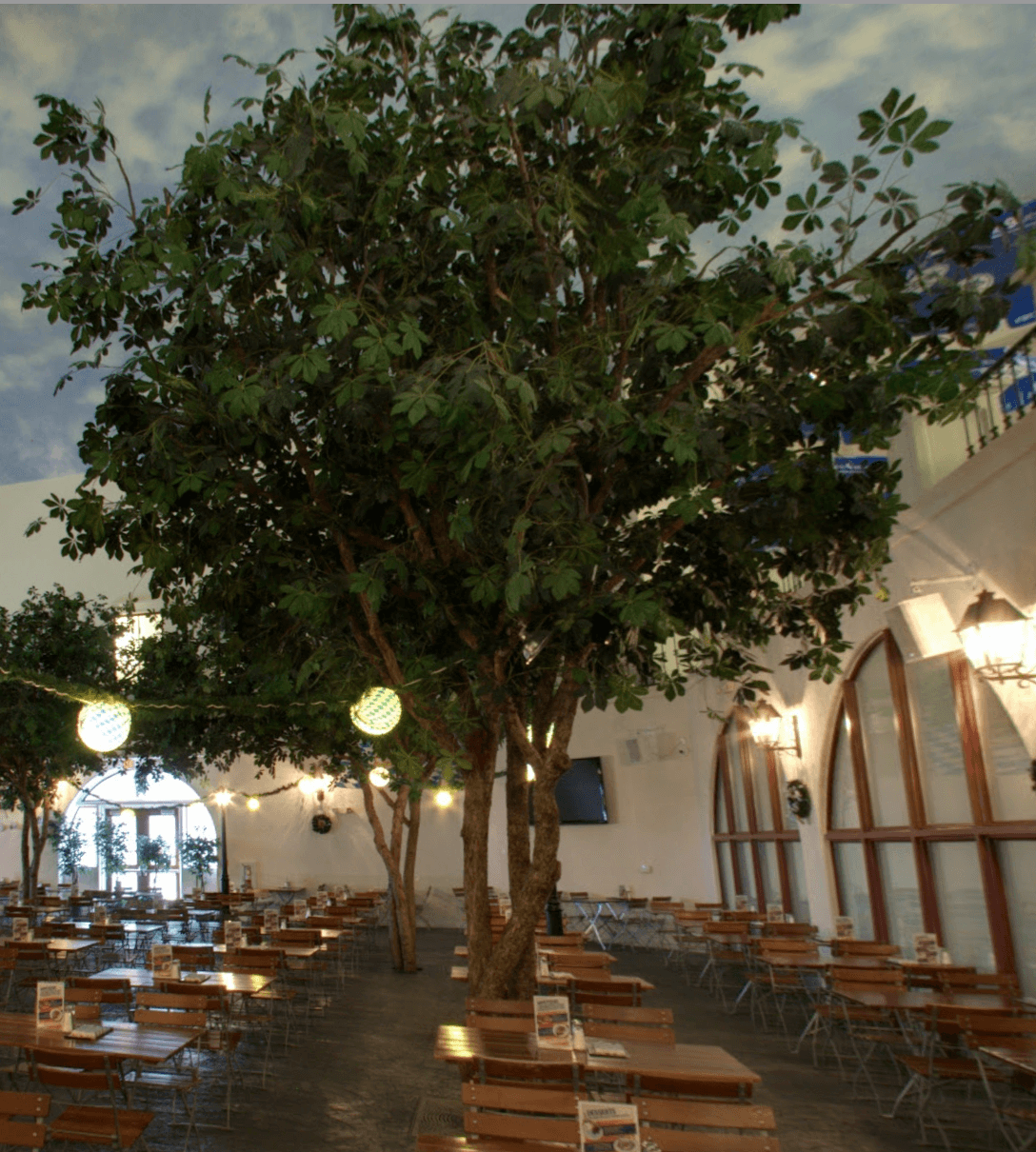 The team at Hofbräuhaus wanted the space to feel just like the Hofbräuhaus in Munich. Vegas temperatures were an issue, so they went with an enclosed space with a blue sky painted on the high ceiling. Our Artificial Chestnut Trees were added as another regionally accurate piece of decor. Per the Hofbräuhaus blog,