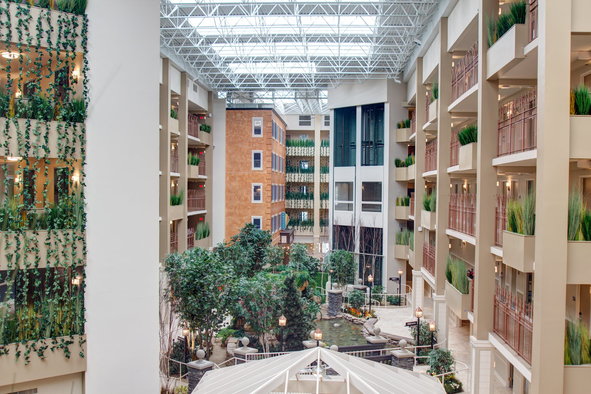 An assortment of bushes, garlands, grasses, and flowers complete the atrium, bringing botanical appeal and the comfort of nature inside for the residents to enjoy. The final touch is the selection of tall Replica Birch Trunks set in front of the elevator.
